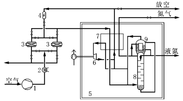 1—空氣壓縮機; 2—預冷機組; 3—分子篩吸附器; 4—電加熱器; 5—冷箱; 6—透平膨脹機; 7—主換熱器; 8—精餾塔; 9—冷凝蒸發(fā)器